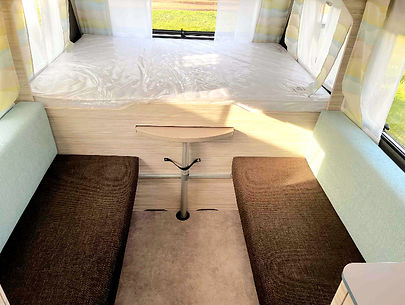 Die große Sitzgruppe ist umbaubar zu einem Bett mit den Maßen 2,30 m x 1,55 m